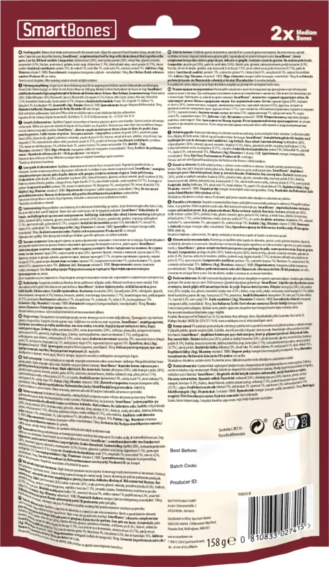 Az összetétel, az analitikai alkotóelemek és az adalékanyagok a SmartBones® minden csomagolásán és a webhelyünkön is megtalálhatók az egyes termékek oldalain az „Összetevők/Tápérték” alatt. Receptúráink zöldség- és csirkealapúak, így az ízükért odavannak a kutyák!