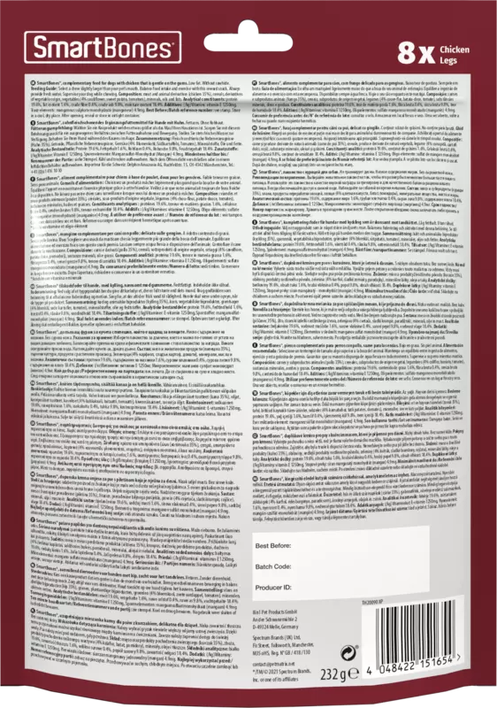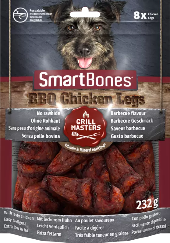 A SmartBones® BBQ csirkecomb ellenállhatatlanul finom, nyersbőrt nem tartalmazó rágófalat, barbecue ízesítéssel és ízletes csirkehússal. A BBQ csirkecomb egyedülálló csirkecomb formájával megjelenésében és illatában is valódi grillhúsnak tűnik, amelynek kutyája egyszerűen nem tud ellenállni.